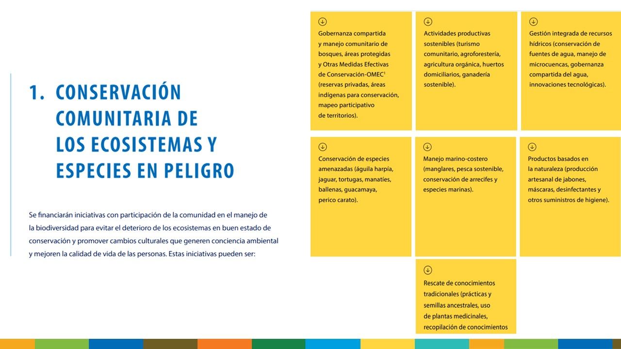 - Conservación comunitaria de los ecosistemas y especies en peligro: Se financiarán iniciativas con participación de la comunidad en el manejo de la biodiversidad para evitar el deterioro de los ecosistemas en buen estado de conservación y promover cambios culturales que generen conciencia ambiental y mejoren la calidad de vida de las personas. Estas iniciativas pueden ser: